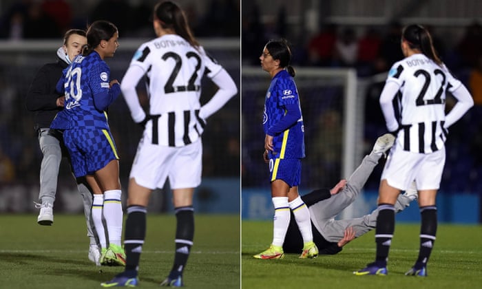 The collision leveled the pitch invader and security finally made their way onto the field to apprehend the individual. 1 day agoChelsea Women striker Sam Kerr was seen shoulder barging a pitch invader in Wednesdays 0-0 draw against Juventus in the UEFA Womens Champions League. Kerr was booked for the offense but the game continued ending in a scoreless draw.